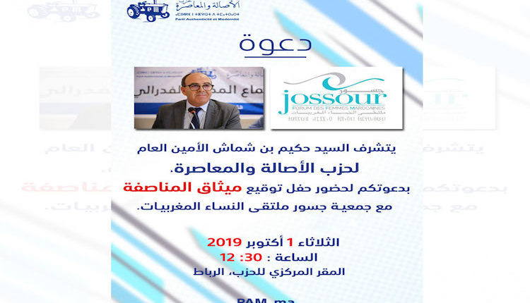 يعقد حكيم بن شماش، الأمين العام لحزب الأصالة والمعاصرة، غدا الثلاثاء فاتح أكتوبر 2019 بالمقر المركزي للحزب بالرباط، لقاء مع رئيسة وأعضاء جمعية جسور ملتقى النساء المغربيات. وبحضور العديد من قيادات الحزب والمناضلات والمناضلين.