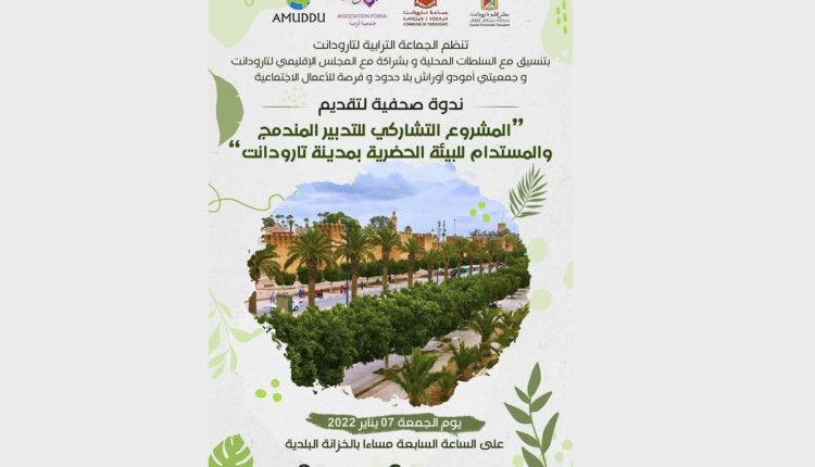 تنظم؛ الجماعة الترابية تارودانت، بتنسيق مع السلطات المحلية وبشراكة مع مجلس إقليم تارودانت، وجمعية أمودو أوراش بلاحدود وجمعية فرصة للأعمال الاجتماعية، ندوة صحفية، لتقديم: “المشروع التشاركي للتدبير المندمج والمستدام للبيئة الحضرية بمدينة تارودانت”.