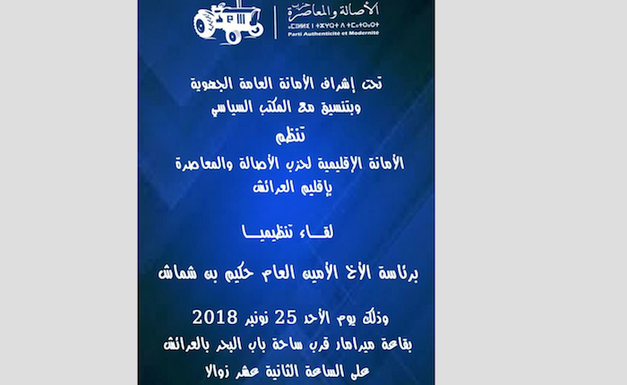 في إطار تنزيل البرنامج التنظيمي الذي سطره المكتب السياسي لحزب الأصالة والمعاصرة، وتنفيذا لبرنامج الأمانة الجهوية في شقه الخاص بهيكلة الحزب على صعيد جهة طنجة تطوان الحسيمة، يــؤطر الأمين العام للحزب السيد حكيم بن شماش، لقاء تنظيمـــــيا بحضور منخرطات ومنخرطي الحزب بإقليم العرائش، وذلك يوم الأحد 25 نونبر الجاري، بقاعة ميرامار قرب ساحة باب البحر بالعرائش على الساعة الثانية عشر زوالا.
