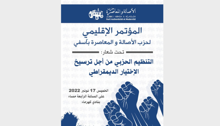 تنظم الأمانة الإقليمية لحزب الأصالة والمعاصرة بإقليم اسفي، يوم الخميس 17 نونبر 2022، ابتداء من الساعة الرابعة عصرا (16:00)؛ بنادي كهرماء، مؤتمرها الإقليمي؛ تحت شعار “التنظيم الحزبي من أجل ترسيخ الديمقراطي”.