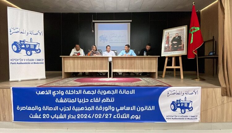على ضوء مخرجات المؤتمر الوطني الخامس لحزب الأصالة والمعاصرة، التي شددت على ضرورة تعزيز التواصل مع مناضلات ومناضلي الحزب والتعامل مع القضايا الداخلية للحزب عبر نقاش عميق ومستفيض، نظمت الأمانة الجهوية لحزب الأصالة والمعاصرة بجهة الداخلة واد الذهب، مساء يومه الثلاثاء 27 فبراير 2024، لقاءاً تواصلياً ناجحاً مع مناضلات ومناضلي الجهة للتعريف وفتح نقاش حول مضامين الوثيقة المذهبية والقانون الأساسي للحزب.