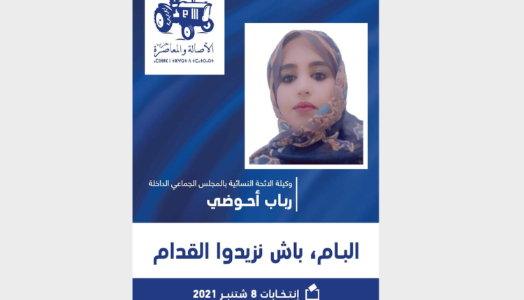 رشحت القيادة الجهوية لحزب الأصالة والمعاصرة بجهة الداخلة وادي الذهب، الإطار رباب احوضي صاحبة مكتب محاسبة، لتكون وكيلة لائحة نساء الاصالة والمعاصرة بمجلس الجماعة الترابية الداخلة، المزمع إجراؤها يوم 8 شتنبر المقبل.