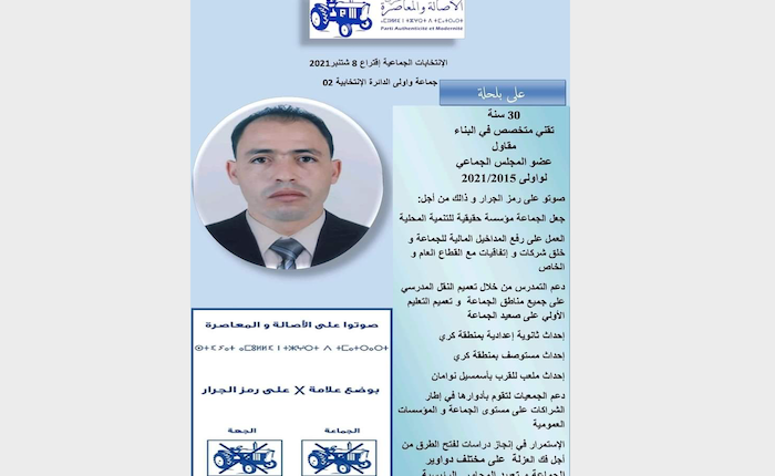 أكد علي بلحلة مرشح حزب الأصالة والمعاصرة للإنتخابات الجماعية 2021 بجماعة واولى بإقليم أزيلال، أنه يدخل غمار هذه الإنتخابات بعزيمة قوية لبلوغ عدة أهداف التي تتمثل بالأساس الرفع من وثيرة النظافة وتجويدها بتقوية اسطولها ومواردها البشرية، وتوسيع العرض الرياضي بخلق ملاعب قرب جديدة، وكذلك احداث ثانوية إعدادية بمنطقة كري.
