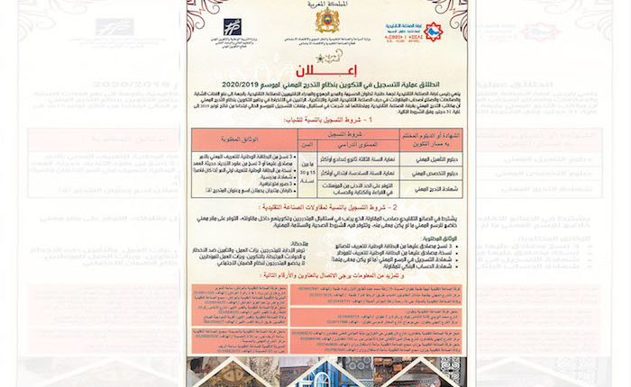 أعلن رئيس غرفة الصناعة التقليدية لجهة طنجة تطوان الحسيمة السيد امحمد لحميدي والسادة: المدير الجهوي والمدراء الاقليميين للصناعة التقليدية بالجهة أن الشباب الذين لا تقل أعمارهم عن 15 سنة ولا تتجاوز 30 سنة، وكذا الصانعات والصناع التقليديين أصحاب المقاولات الحرفية الفنية والإنتاجية الراغبين في الانخراط في برنامج التكوين بنظام التدرج المهني، يمكنهم التسجيل برسم موسم 2019/2020 وأن عملية التسجيل مستمرة إلى غاية 31 دجنبر 2019 بمكاتب التكوين بالتدرج بمقر الغرفة بطنجة وملحقاتها على صعيد الجهة، ومراكز التكوين بالتدرج المهني بمدن الجهة.