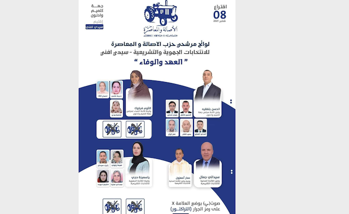 إلى ذلك، تمت تزكية السيدة كلثوم فيكوك وكيلة للائحة الاصالة والمعاصرة النسائية بمجلس الجهة عن سيدي إفني.