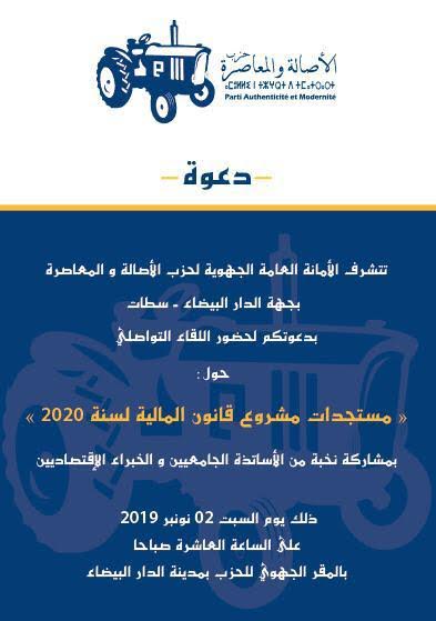يحتضن المقر الجهوي لحزب الأصالة والمعاصرة بجهة الدار البيضاء سطات، يوم السبت 02 نونبر 2019 ابتداء من الساعة العاشرة، (يحتضن) لقاء تواصليا حول موضوع، “مستجدات مشروع قانون المالية لسنة 2020″، وذلك بتأطير  نخبة من الأساتذة الجامعيين والخبراء الإقتصاديين.