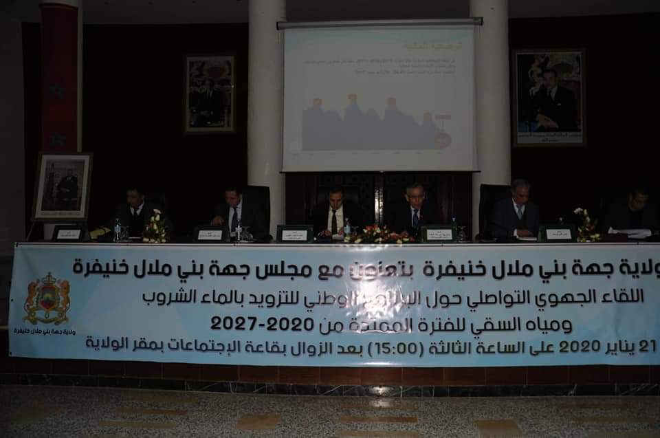 احتضن مقر ولاية جهة بني ملال خنيفرة، يوم الثلاثاء 21 يناير 2019، لقاء تواصليا وتحسيسيا حول البرنامج الوطني للتزويد بالماء الشروب ومياه السقي 2020-2027 ، الذي أطلقه أخيرا الملك محمد السادس بغلاف مالي قدره 115.4 مليار درهم، وذلك بمشاركة إبراهيم مجاهد رئيس مجلس جهة بني ملال خنيفرة، والوالي والعمال والكتاب العامون لأقاليم الجهة، ورؤساء المصالح الخارجية والسلطات المدنية والعسكرية بالجهة.