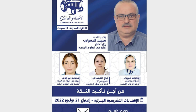 وتجدر الإشارة إلى أن لائحة محمد الحموتي تضم كل من السيدات، الأستاذة خديجة حبوبي، أستاذة جامعية ودكتورة في الكيمياء، وفرح العيساتي، مقاولة وباحثة في سلك الدكتوراة، ومنتصرة بن جدي، باحثة في سلك الدكتوراه.