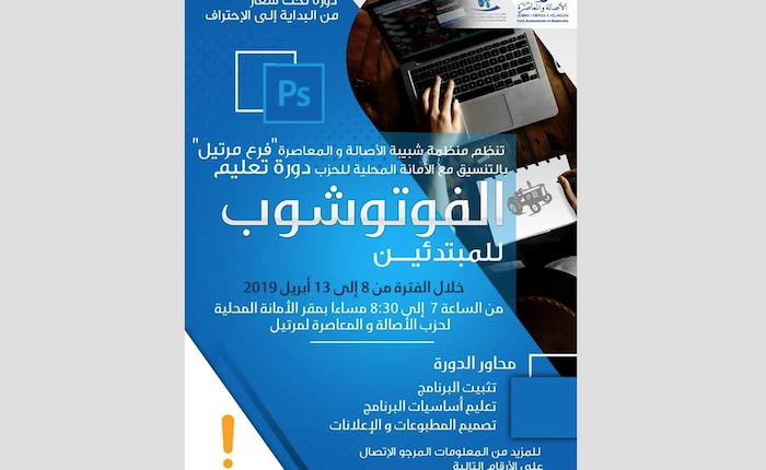 تنظم منظمة شباب حزب الأصالة والمعاصرة فرع مرتيل بتنسيق مع الأمانة المحلية للحزب بمرتيل، دورة تعليم الفوطوشوب للمبتدئـــــين، تحت شعار: ” من البداية إلى الاحتراف”، وذلك خلال الفترة الممتدة ما بين 08 و13 أبريل 2019 (يوميا) من الساعة 19:00 إلى الساعة 20:30، بمقر الأمانة المحلية للبام بمرتيل.
