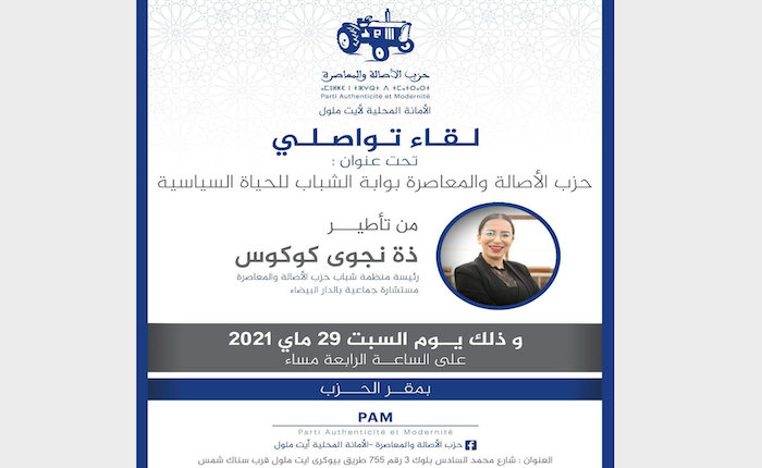 وستتكلف نجوى كوكوس رئيسة منظمة شباب حزب الأصالة والمعاصرة والمستشارة بمجلس مدينة الدار البيضاء، تأطير هذا اللقاء التواصلي الذي من المنتظر أن يشارك فيه مجموعة من الشباب بايت ملول والأقاليم المجاورة.