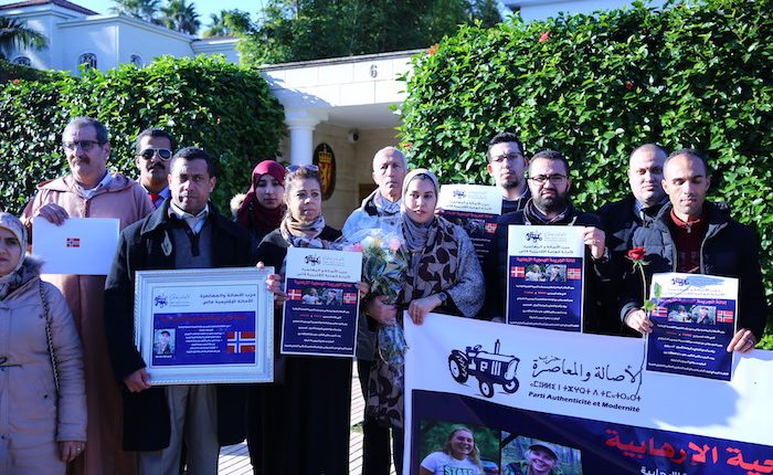 نظمت الأمانة العامة الإقليمية لحزب الأصالة والمعاصرة بإقليم فاس، اليوم الأربعاء 26 دجنبر 2018، وقفة تضامنية أمام سفارتي النرويج والدنمارك بالرباط، للتنديد بالجريمة الهمجية التي راح ضحيتها سائحتين من النرويج والدانمارك بمنطقة إمليل بإقليم الحوز.
