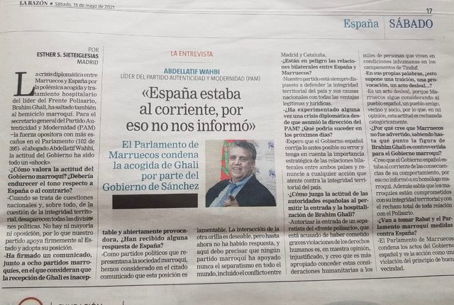 وأكد وهبي في حوار مع صحيفة “لارازون” الإسبانية حول موضوع العلاقات المغربية الإسبانية على هامش استضافة مدريد لزعيم جبهة البوليساريو الانفصالية، – أكد – أن الأحزاب المغربية وهي تمثل المجتمع المغربي تأسفت لقرار الحكومة الإسبانية وهي أحزاب مغربية لم يسبق لها أن ساندت الانفصال بما في ذلك ما حدث بين مدريد وجهة كاتالونيا.