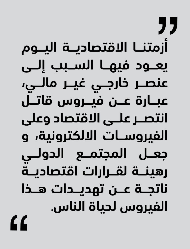 أما اليوم، فأزمتنا الاقتصادية يعود فيها السبب إلى عنصر خارجي غير مالي، عبارة عن فيروس قاتل انتصر على الاقتصاد وعلى الفيروسات الالكترونية، و جعل المجتمع الدولي رهينة لقرارات اقتصادية ناتجة عن تهديدات هذا الفيروس لحياة الناس، فأدخل العالم بأسره في مرحلة كساد، ليدخل الاقتصاد الدولي في غيبوبة سريرية إجبارية، كنتيجة مباشرة لاختفاء العنصر البشري واحتماءه بالحجر الصحي، لتتوقف معه آلية الإنتاج، ثم عجلة الاقتصاد ككل، مقابل حركية جد محدودة في الاستهلاك.