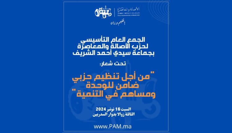 في إطار الدينامية التنظيمية لحزب الأصالة والمعاصرة بإقليم وزان، وتنفيذا لميثاق تعاقد الأمانات الجهوية، وتحت إشراف الأمانة الجهوية للحزب بجهة طنجة تطوان الحسيمة؛ تعقد الأمانة الإقليمية للحزب بإقليم وزان الجمع العام التأسيسي للأمانة المحلية بجماعة سيدي أحمد الشريف تحت شعار: “من أجل تنظيم حزبي ضامن للوحدة ومسهم في التنمية”.
