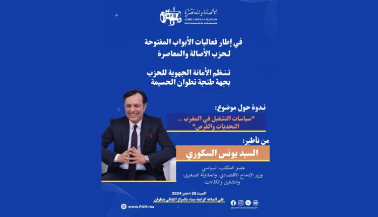 في إطار فعاليات الأبواب المفتوحة لحزب الأصالة والمعاصرة، تنظم الأمانة الجهوية للحزب بجهة طنجة تطوان الحسيمة، ندوة حول موضوع: “سياسات التشغيل في المغرب ..التحديات والفرص”، من تأطير السيد يونس السكوري، عضو المكتب السياسي و وزير الإدماج الاقتصادي والمقاومة الصغرى، والتشغيل والكفاءات.