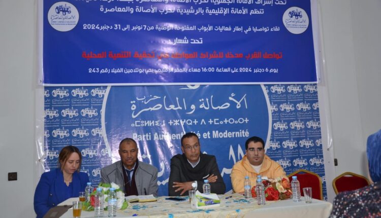 ضمن فعاليات النسخة الأولى للأبواب الوطنية المفتوحة التي أطلقها قطب التنظيم تحت شعار : “تواصل القرب مدخل لإشراك المواطن في تحقيق التنمية”، وتحت إشراف الأمانة الجهوية لحزب الأصالة والمعاصرة بجهة درعة تافيلالت، نظمت الأمانة الإقليمية للحزب بإقليم الرشيدية لقاء تواصليا؛ يوم الجمعة 06 دجنبر 2024 بالمقر الإقليمي للحزب بالرشيدية.
