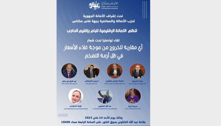 تحت إشراف الأمانة الجهوية لحزب الأصالة والمعاصرة بجهة فاس مكناس، تنظم الأمانة الإقليمية للبام بإقليم الحاجب؛ لقاء تواصليا تحت شعار: “أي مقاربة للخروج من موجة غلاء الأسعار في ظل أزمة التضخم”.