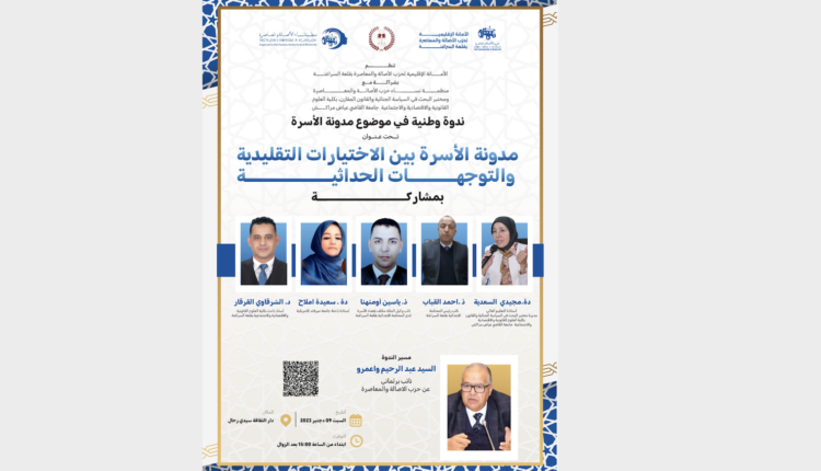 تنظم الأمانة الإقليمية لحزب الأصالة والمعاصرة بقلعة السراغنة، بشراكة مع منظمة نساء الأصالة والمعاصرة، ومختبر البحث في السياسة الجنائية والقانون المقارن بكلية العلوم القانونية والاقتصادية والاجتماعية بجامعة القاضي عياض بمراكش، يوم السبت 9 دجنبر 2023، بدار الثقافة سيدي رحال، ندوة وطنية حول موضوع مدونة الأسرة تحت عنوان: “مدونة الأسرة بين الاختيارات التقليدية