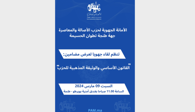 تنظم؛ الأمانة الجهوية لحزب الأصالة والمعاصرة بجهة طنجة تطوان الحسيمة؛ لقاء جهويا لعرض مضامين القانون الأساسي والوثيقة المذهبية للحزب.