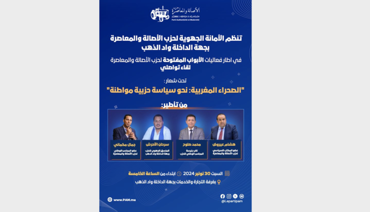 تنظم الأمانة الجهوية لحزب الأصالة والمعاصرة بجهة الداخلة واد الذهب؛ في إطار فعاليات الأبواب المفتوحة للحزب؛ لقاء تواصليا تحت شعار: “الصحراء المغربية: نحو سياسة حزبية مواطنة”.
