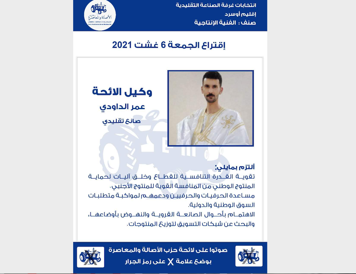 وأضاف وكيل لائحة الجرار بأوسرد، أنه يسعى من خلال ترشحه إلى النهوض بهذا القطاع الحيوي وتقوية مكانته وتعزيز الادوار المنوطة منه، أنه ولأجل تحقيق هذه الغاية وجب تمكين المهنيين (الصناع التقليديين) من آلية ترافعية وتمثلية قوية تتوفر على كل ضمانات تحقيق حضور قوي لغرفة الصناعة التقليدية ضمن الإستراتيجية الوطنية للتنمية الشاملة والمستدامة.