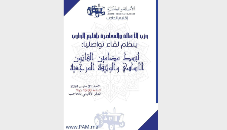 ينظم حزب الأصالة والمعاصرة بإقليم الحاجب، لقاء تواصليا لبسط مضامين القانون الأساسي والوثيقة المرجعية.