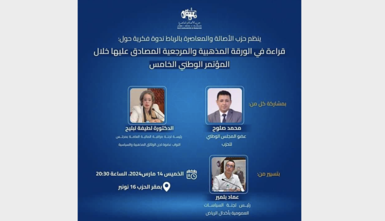 ينظم حزب الأصالة والمعاصرة بالرباط؛ ندوة فكرية حول: “قراءة في الورقة المذهبية والمرجعية المصادق عليها خلال المؤتمر الوطني الخامس”.