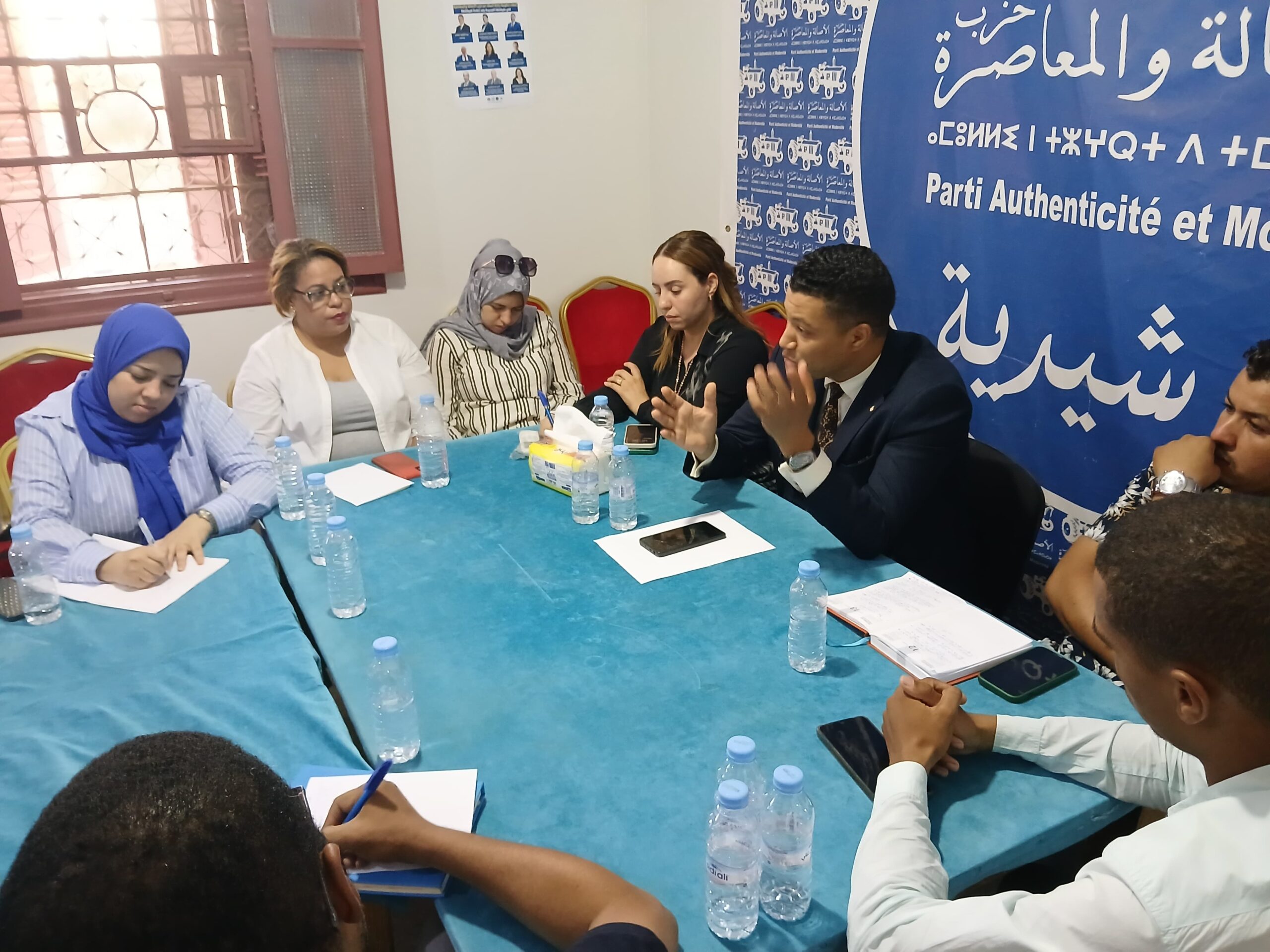 وأطر هذا اللقاء كل من وفاء الطائع، الأمينة المحلية وعضو المكتب التنفيذي لمنظمة شباب حزب الأصالة والمعاصرة، وزكرياء لمراني علوي، المحامي بهيئة مكناس، بحضور ثلة من مناضلات ومناضلي الحزب، إلى جانب مجموعة من الشباب المهتمين بالشأن العام المحلي.