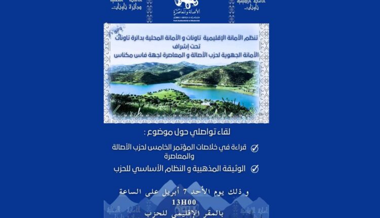 تنظم الأمانة الإقليمية والأمانة المحلية لحزب الأصالة والمعاصرة بدائرة تاونات، تحت إشراف الأمانة الجهوية للحزب بجهة فاس- مكناس، لقاء تواصليا حول موضوع: