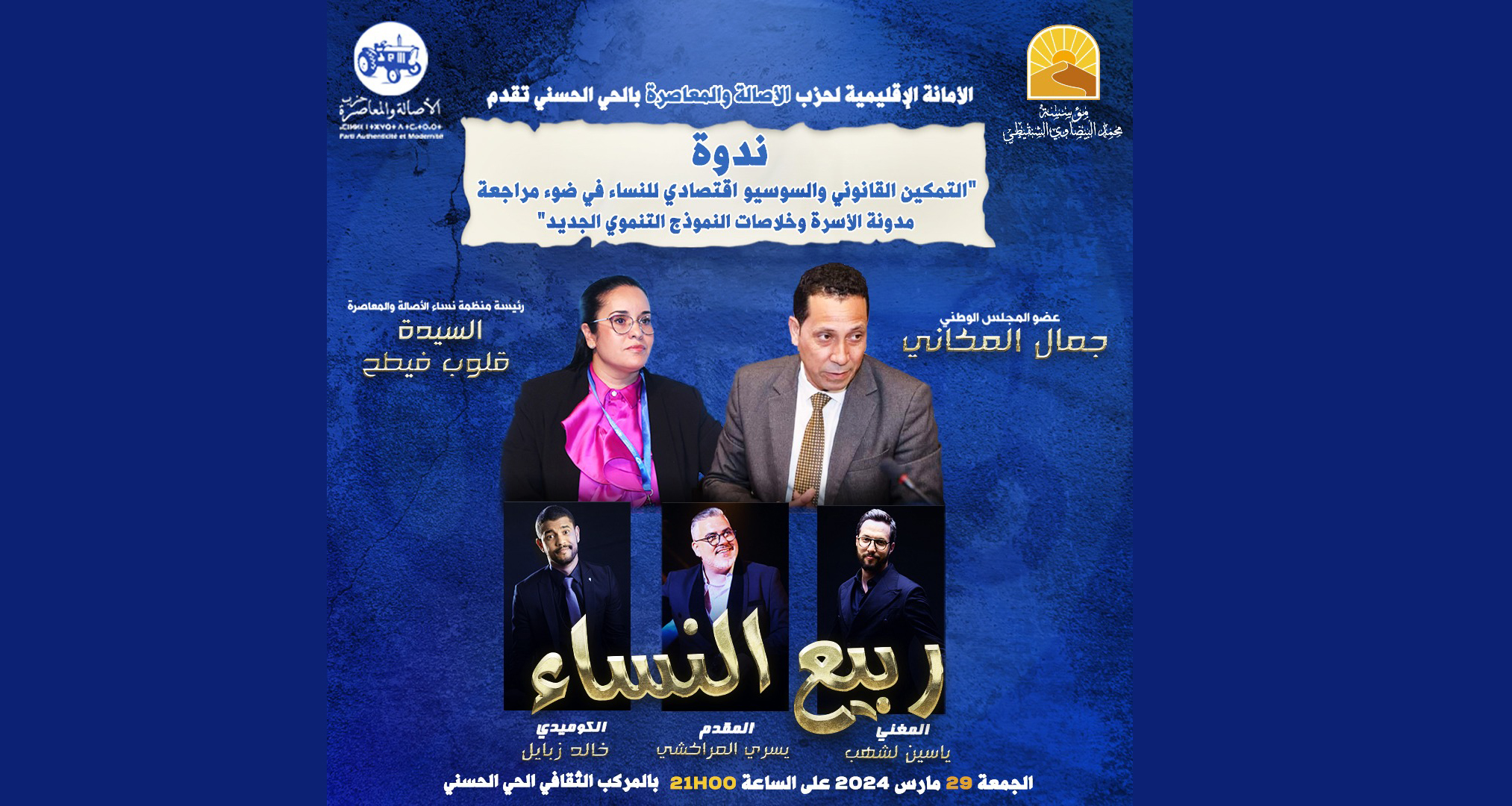 تنظم؛ الأمانة الإقليمية لحزب الأصالة والمعاصرة بعمالة مقاطعة الحي الحسني بالدار البيضاء، ندوة تفاعلية حول موضوع “التمكين القانوني والسوسيو اقتصادي للنساء، في ضوء مراجعة مدونة الأسرة وخلاصات النموذج التنموي الجديد”.