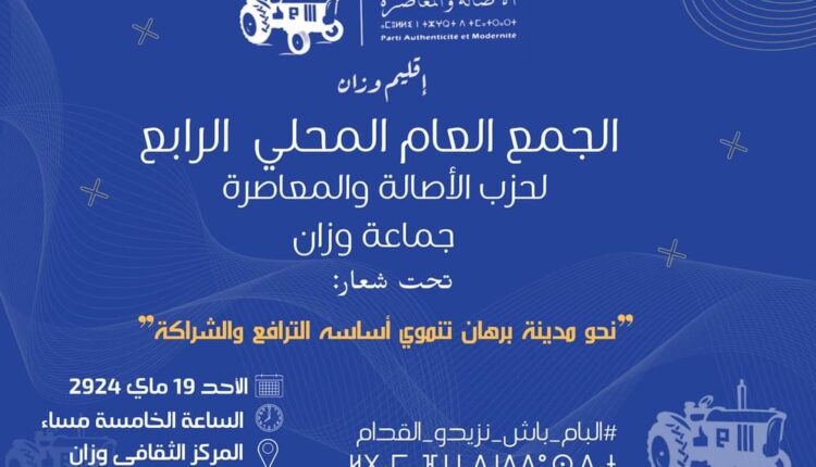 بمناسبة مرور 14 سنة على وضع اللبنات الأولى لحزب الأصالة والمعاصرة بوزان، وتنزيلا لمخرجات المؤتمر الوطني الخامس للحزب؛ وتفعيلا للدينامية التي أطلقتها القيادة الجماعية للأمانة العامة، وتحت إشراف الأمانة الجهوية للحزب بجهة طنجة تطوان الحسيمة، تعقد الأمانة الإقليمية للحزب بإقليم وزان أشغال الجمع العام المحلي للحزب بجماعة وزان؛ تحت شعار: “نحو مدينة برهان تنموي أساسه الترافع والشراكة”