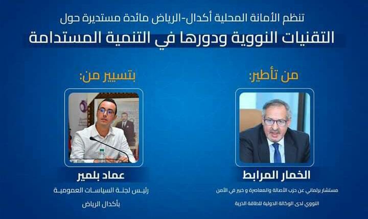 النووية ودورها في التنمية المستدامة”؛ يؤطرها المستشار البرلماني عن حزب الأصالة والمعاصرة- الخبير في الأمن النووي لدى الوكالة الدولية للطاقة الذرية؛ الدكتور الخمار المرابط؛ ويسير أشغالها رئيس لجنة السياسات العمومية بأكدال الرياض، عماد بلمير.