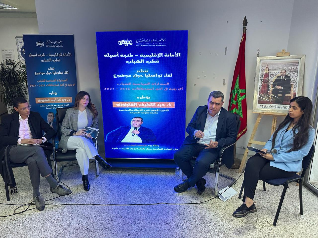 نظمت الأمانة الإقليمية لحزب الأصالة والمعاصرة بعمالة طنجة-أصيلة، عبر قطب الشباب، اليوم الجمعة 18 أبريل الجاري، بالمقر الجهوي للحزب بطنجة، لقاء تواصليا حول موضوع “المشاركة السياسية للشباب.. أي رؤية في أفق استحقاقات 2026-2027″، أطره الأمين الجهوي للحزب بجهة طنجة- تطوان- الحسيمة، عبد اللطيف الغلبزوري، بحضور عدد من مناضلي ومناضلات الحزب.