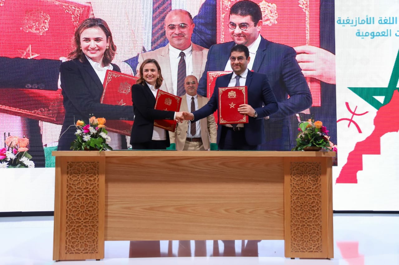 وعرف هذا الحفل توقيع أربع اتفاقيات شراكة بين وزارة الانتقال الرقمي وإصلاح الإدارة وأربعة قطاعات وزارية، هدفها تعزيز إدماج اللغة الأمازيغية بجميع مصالحها، حيث تهم اتفاقيتا الشراكة الموقعتان مع كل من وزارة العدل ووزارة الصحة والحماية الاجتماعية تعزيز التوجيه والإرشاد باللغة الأمازيغية، من خلال توفير أعوان مكلفين باستقبال وتوجيه وإرشاد المرتفقين الناطقين باللغة الأمازيغية على مستوى مختلف مصالح الوزارتين، بالإضافة إلى توفير أعوان مكلفين بالتواصل الهاتفي باللغة الأمازيغية، علاوة على إدماج اللغة الأمازيغية في علامات ولوحات التشوير بمختلف الإدارات العمومية التابعة للقطاعين.