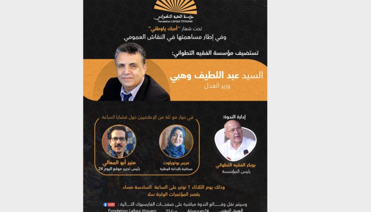تستضيف، مؤسسة الفقيه التطواني للعلم والأدب، وزير العدل، السيد عبد اللطيف وهبي، في لقاء مفتوح حول قضايا الساعة التي تستأثر باهتمام الرأي العام ؛ وذلك مساء الثلاثاء فاتح نونبر القادم بقصر المؤتمرات بسلا.