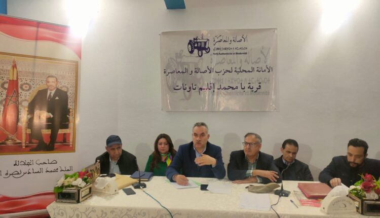 وعقد الجمع العام تحت إشراف الأمين العام الجهوي للحزب بجهة فاس- مكناس، الدكتور محمد الحجيرة؛ والمستشار البرلماني/ عضو المكتب السياسي؛ الدكتور الخمار المرابط؛ والأمين العام الإقليمي بتاونات، ذ.محمد النجاري، ونائب رئيس مجلس جهة فاس مكناس؛ د.عبد الحق أبو سالم؛ ورئيسة منظمة نساء الأصالة والمعاصرة بتاونات، ذة.فدوى دادون؛ وعضوي الأمانة الإقليمية بتاونات؛ ذ.محمد لطفي والسيد عماد الدراني.