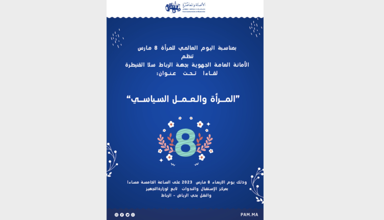 بمناسبة اليوم العالمي للمرأة الذي يصادف الثامن من مارس من كل سنة، تنظم الأمانة الجهوية لحزب الأصالة والمعاصرة بجهة الرباط سلا القنيطرة، يوم الأربعاء 8 مارس 2023، بمركز الاستقبال والندوات التابع لوزارة التجهيز والنقل بحي الرياض، لقاءً تحت عنوان “المرأة والعمل السياسي”.