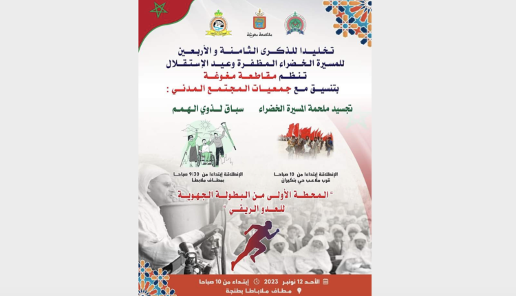 ينظم؛ مجلس مقاطعة مغوغة (عمالة طنجة- أصيلة)؛ في إطار الاحتفالات المخلدة للذكرى 48 للمسيرة الخضراء المظفرة؛ وعيد الاستقلال؛ المحطة الأولى من البطولة الجهوية للعدو الريفي.