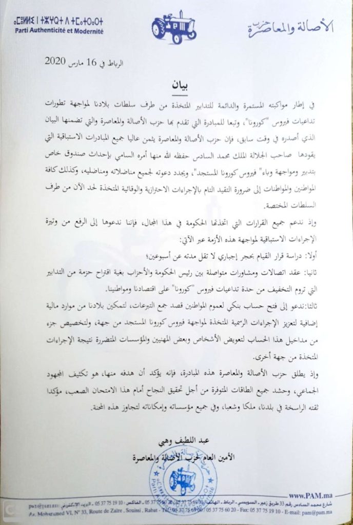 في إطار مواكبته المستمرة والدائمة للتدابير المتخذة من طرف سلطات بلادنا لمواجهة تطورات تداعيات فيروس “كورونا”، وتبعا للمبادرة التي تقدم بها حزب الأصالة والمعاصرة والتي تضمنها البيان الذي أصدره في وقت سابق، فإن حزب الأصالة والمعاصرة يثمن عاليا جميع المبادرات الاستباقية التي يقودها صاحب الجلالة الملك محمد السادس حفظه الله منها أمره السامي بإحداث صندوق خاص بتدبير ومواجهة وباء” فيروس كورونا المستجد”، ويجدد دعوته لجميع مناضلاته ومناضليه، وكذلك كافة المواطنين والمواطنات إلى ضرورة التقيد التام بالإجراءات الاحترازية والوقائية المتخذة لحد الآن من طرف السلطات المختصة.