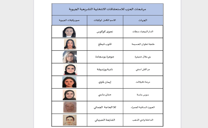 وسيعلن الحزب لاحقا عن باقي مرشحات هذه الاستحقاقات لما تبقى من جهات المملكة.