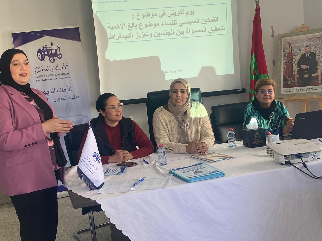 نظم، المكتب الجهوي لمنظمة نساء الأصالة والمعاصرة بجهة طنجة تطوان الحسيمة، بتنسيق مع الأمانة الجهوية للحزب، يوم السبت 22 فبراير الجاري؛ بالمقر الجهوي للحزب بطنجة، دورة تكوينية حول موضوع: “التمكين السياسي للنساء”؛ أطرتها عضو المكتب التنفيذي لمنظمة النساء ؛ السيدة مينة الروشاطي، بحضور رئيسة المنظمة، السيدة قلوب فيطح، ورئيسة المكتب الجهوي للمنظمة، السيدة أسماء اهراو، والسيدات أعضاء المنظمة جهويا وإقليميا، وعدد من المستشارات الجماعيات ومناضلات الحزب اللواتي يمثل عمالتي وأقاليم الجهة.