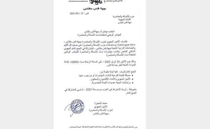يتشرف الأمين الجهوي لحزب الأصالة والمعاصرة بجهة فاس مكناس، بدعوة جميع منتخبات ومناضلات الحزب على صعيد كل أقاليم والجماعات التابعة للجهة، للمشاركة في الجمع العام الجهوي الداخلي الخاص بانتداب مؤتمرات في المؤتمر الوطني لمنظمة نساء الأصالة والمعاصرة.