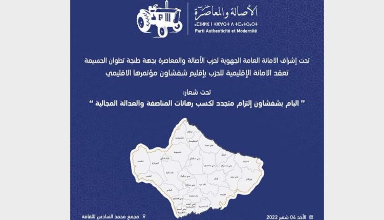 تنظم الأمانة العامة الإقليمية للحزب بإقليم شفشاون، مؤتمرها الإقليمي، تحت شعار: “البام بشفشاون التزام متجدد لكسب رهانات المناصفة والعدالة المجالية”.