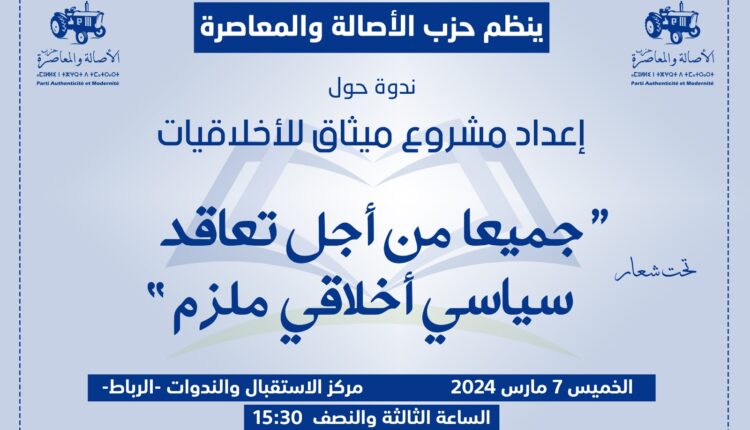 ينظم حزب الأصالة والمعاصرة؛ ندوة حول إعداد مشروع ميثاق للأخلاقيات؛ تحت شعار: “جميعا من أجل تعاقد سياسي أخلاقي ملزم”.