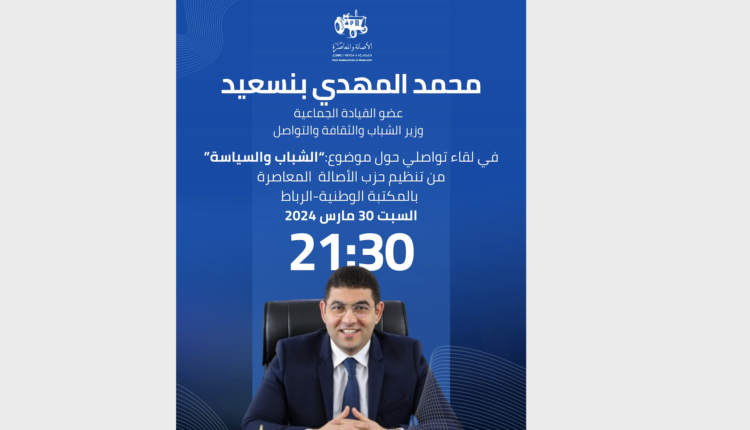 يؤطر؛ عضو القيادة الجماعية للأمانة العامة لحزب الأصالة والمعاصرة- وزير الشباب والثقافة والتواصل؛ محمد المهدي بنسعيد؛ لقاء تواصليا من تنظيم الحزب؛ حول موضوع: “الشباب والسياسة”.