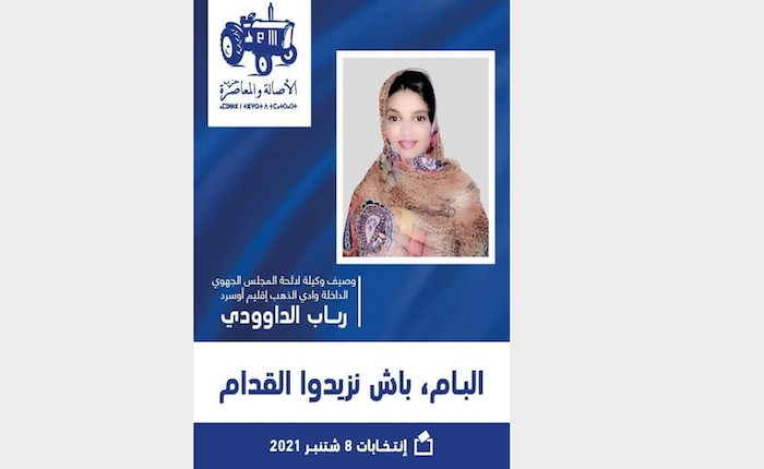 رشحت القيادة الجهوية لحزب الأصالة والمعاصرة بجهة الداخلة وادي الذهب، رباب الداودي، مقاولة ذاتية، لتكون وصيفة وكيلة لائحة نساء الاصالة والمعاصرة بمجلس جهة الداخلة وادي الذهب عن دائرة اقليم اوسرد، المزمع إجراؤها يوم 8 شتنبر المقبل.