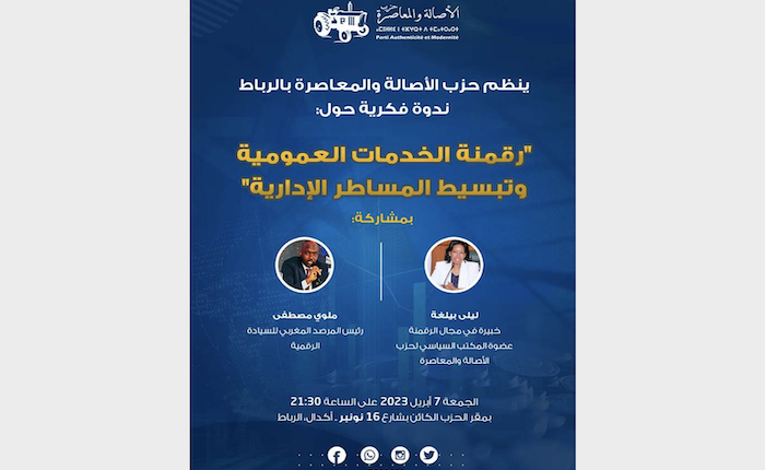 ينظم حزب الأصالة والمعاصرة بالرباط؛ ندوة فكرية حول موضوع: “رقمنة الخدمات العمومية وتبسيط المساطر الإدارية”.