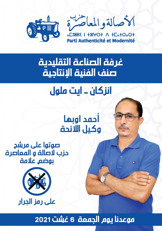 يصر مرشح حزب الأصالة والمعاصرة أحمد أوبها لاستحقاقات السادس من غشت المقبل صنف الصناعة التقليدية الانتاجية والفنية الخاصة بانتخاب أعضاء الغرف المهنية، على الظفر بتمثيلية قوية للحزب خلال الولاية المقبلة، معتمدا على تجربته وحصيلته المشرفة، بعدما سبق له حجز مكانه خلال ولايتين سابقيتين، لأجل إتمام وتنفيذ عدد من المشاريع المهمة التي ستنهض باوضاع المهنيين وتحسن من مستواهم المهني والمعيشي.