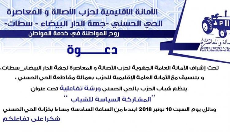 تفعيلا للدينامية المتجددة التي تشهدها شبيبة حزب الأصالة والمعاصرة في كل ربوع المملكة المغربية، تنظم شبيبة حزب الأصالة والمعاصرة بعمالة مقاطعة الحي الحسني بالدار البيضاء، يوم السبت 10 نونبر 2018 على الساعة السادسة مساء بخزانة الحي الحسني، ورشة تفاعلية تحت شعار “المشاركة السياسية للشباب”.