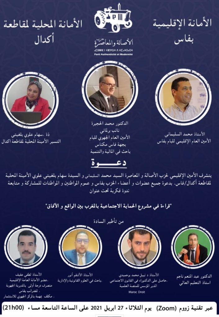 في إطار الأنشطة الفكرية والسياسية والتنظيمية لحزب الأصالة والمعاصرة بجهة فاس-مكناس عامة، وبإقليم فاس على الخصوص، نظمت الأمانة المحلية للحزب بمقاطعة أكدال ندوة فكرية، مساء يوم الثلاثاء 27 أبريل 2021، “عن بعد” تحت عنوان: “قراءة في مشروع الحماية الاجتماعية بالمغرب بين الواقع والآفاق”.